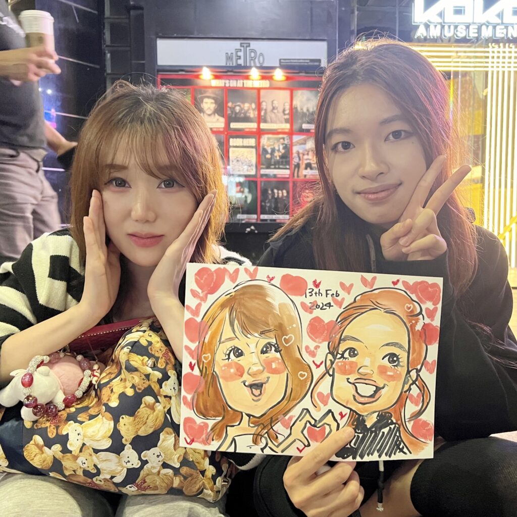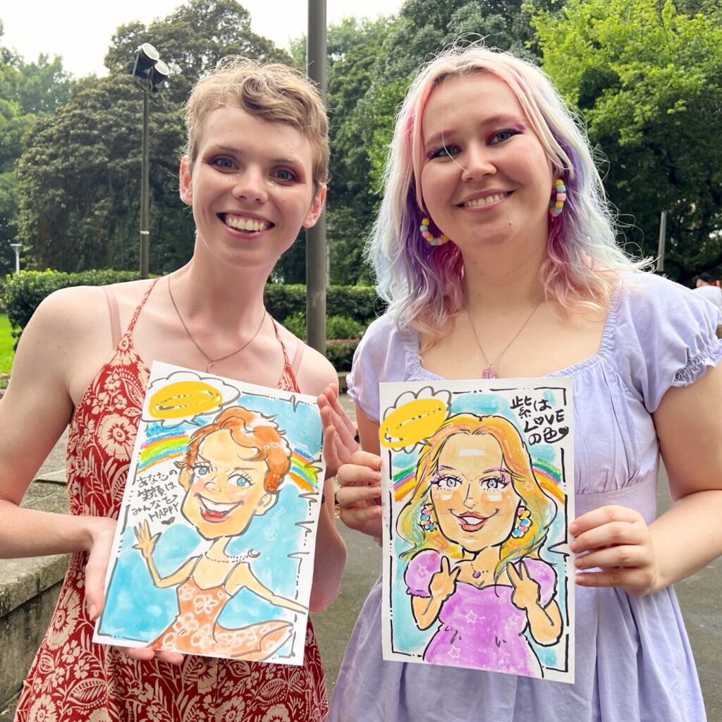 色紙サイズで1時間にカラーで4〜5人、白黒で5〜7人ほどお描きできます。とにかく沢山のお客様を描いてほしいイベントなどの場合は、用紙を【ハガキサイズ(ワンカラー)/お一人様5分】にするなど、ご依頼者様の希望に添えるようにできる限り柔軟に対応させていただきます!